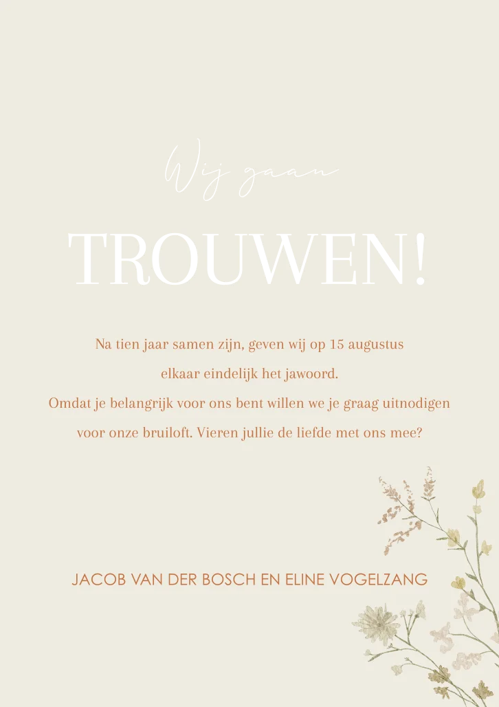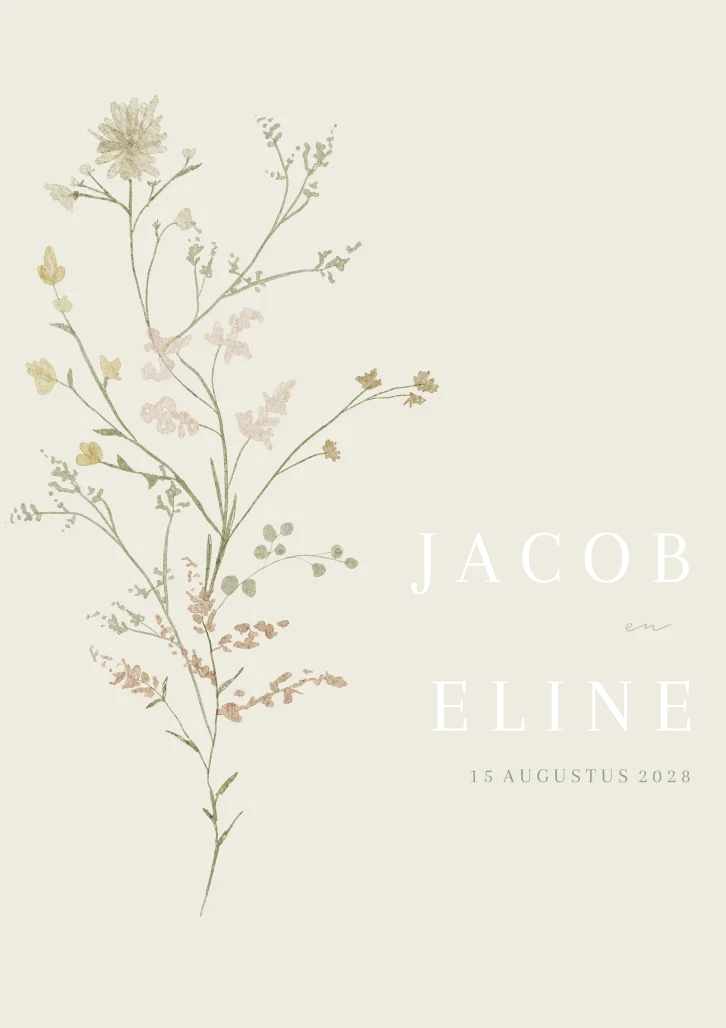 Een romantische trouwkaart met illustraties van een mooi veldboeket aan bloemen in waterverf stijl. Je past deze trouwkaart eenvoudig aan in onze online editor. Wil je er graag bijpassend ander drukwerk bij hebben? Neem dan vrijblijvend contact met ons op. Kaart Jacob & Eline.