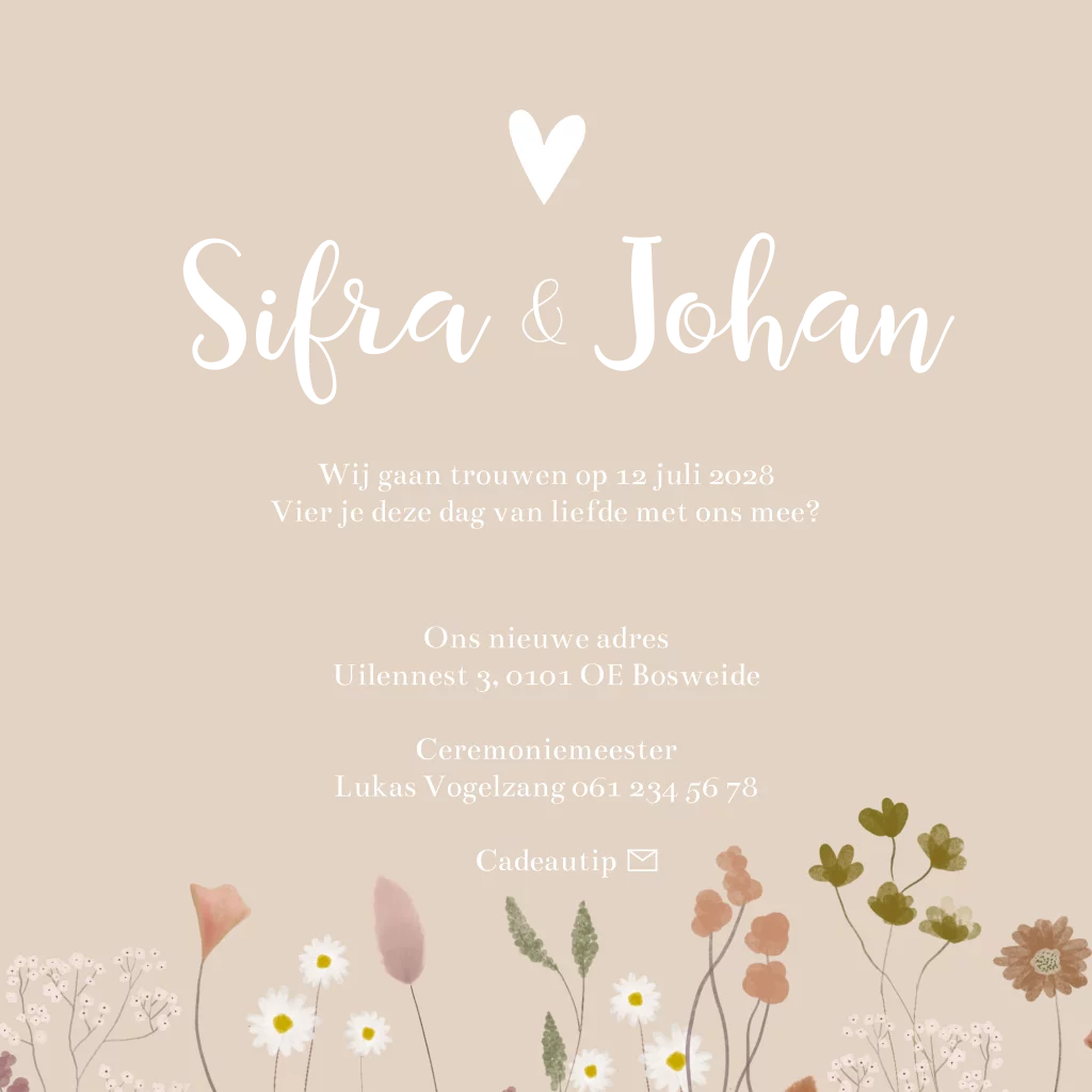 Een stijlvolle trouwkaart Sifra & Johan met een getekend bloemenveld met droogbloemen. De trouwkaart oogt daardoor erg zacht maar toch vrolijk. De goudfolie letters maken de kaart heel chique.