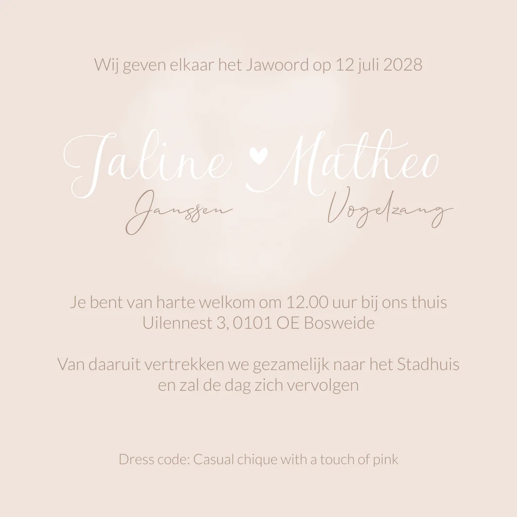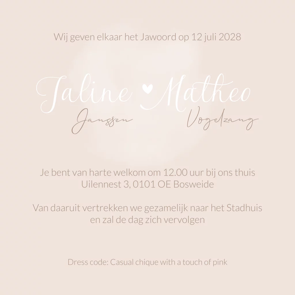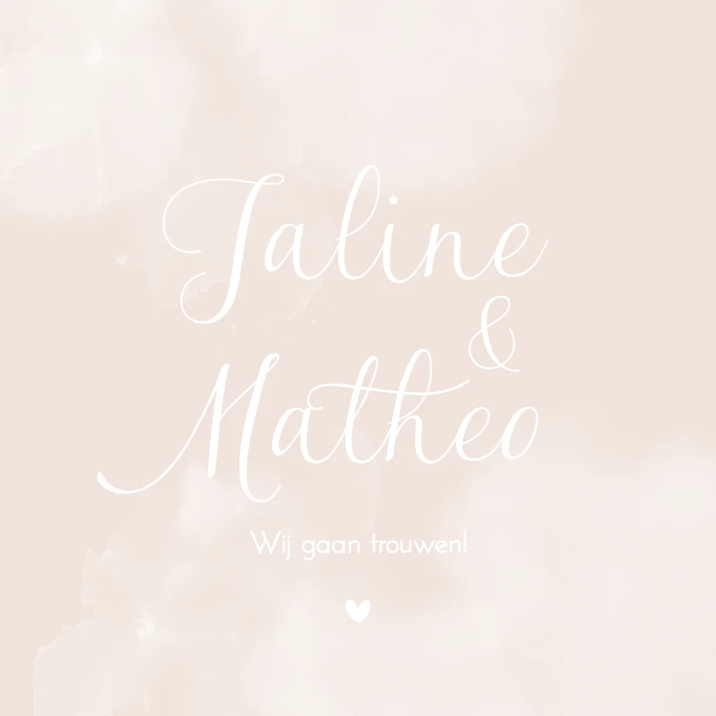 Een stijlvol trouwkaartje in zacht roze naturel kleur met goudfolie letters en hartjes. Kaart Jaline & Matheo kun je eenvoudig aanpassen van kleur en/of opmaak.