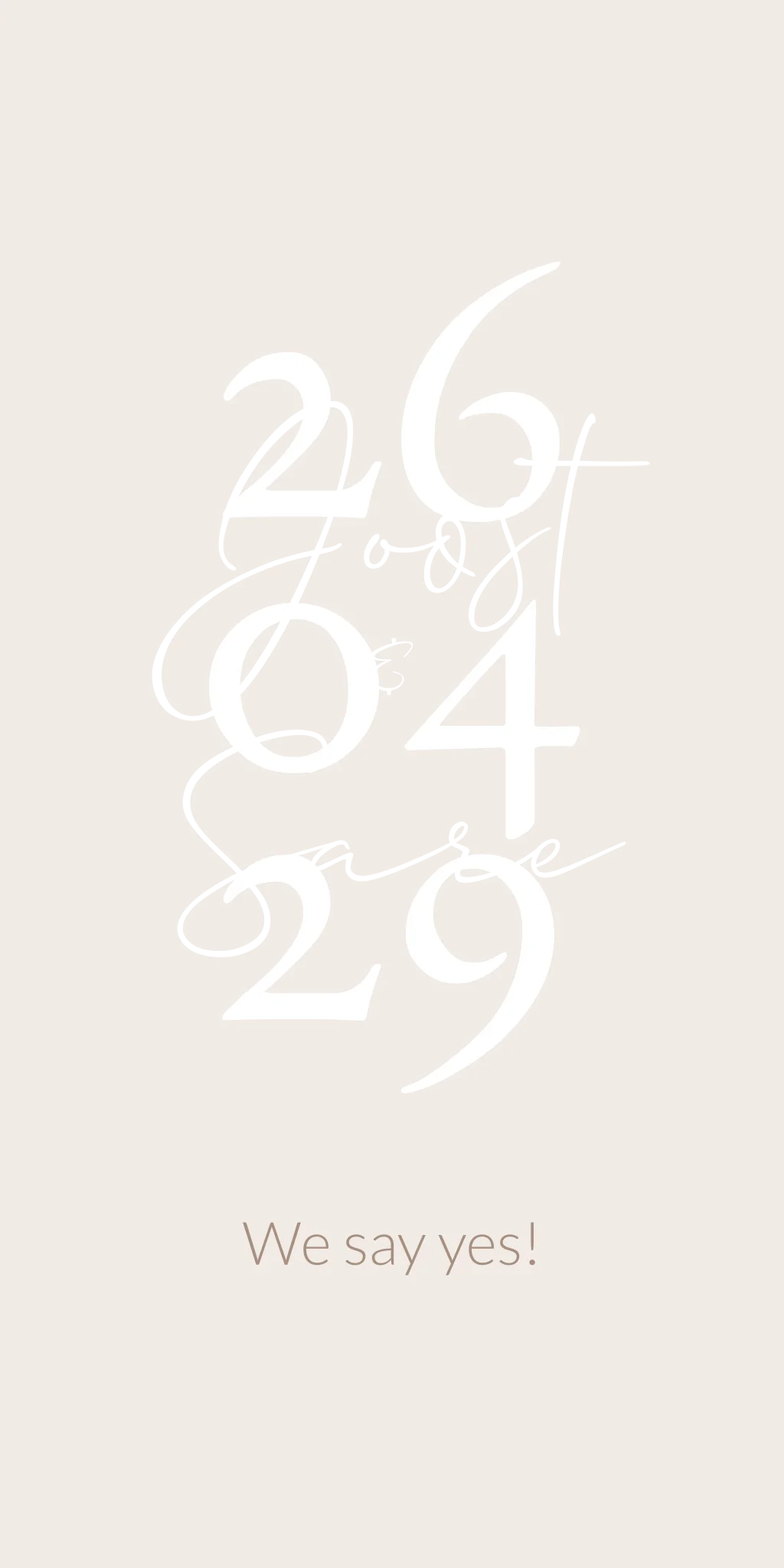 Een strak en moderne trouwkaart in beige naturel kleur met witte grote cijfers van de trouwdatum. Met goudfolie zijn de namen van het echtpaar in sierlijke letters geplaatst met daaronder de tekst: We say yes!