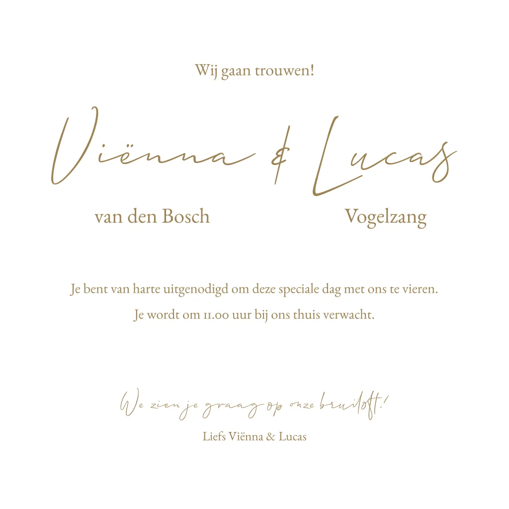 Een romantische trouwkaart met een waterverf/aquarel illustratie van een boeket met verschillende veldbloemen. Kaartje Viënna & Lucas heeft een rustige uitstraling door het gebruik van één kleurenfamilie en wordt door het gebruik van klassieke lettertypes een tijdloos ontwerp. Wil je graag iets aanpassen? Neem dan een kijkje in de editor voor de vele opties!