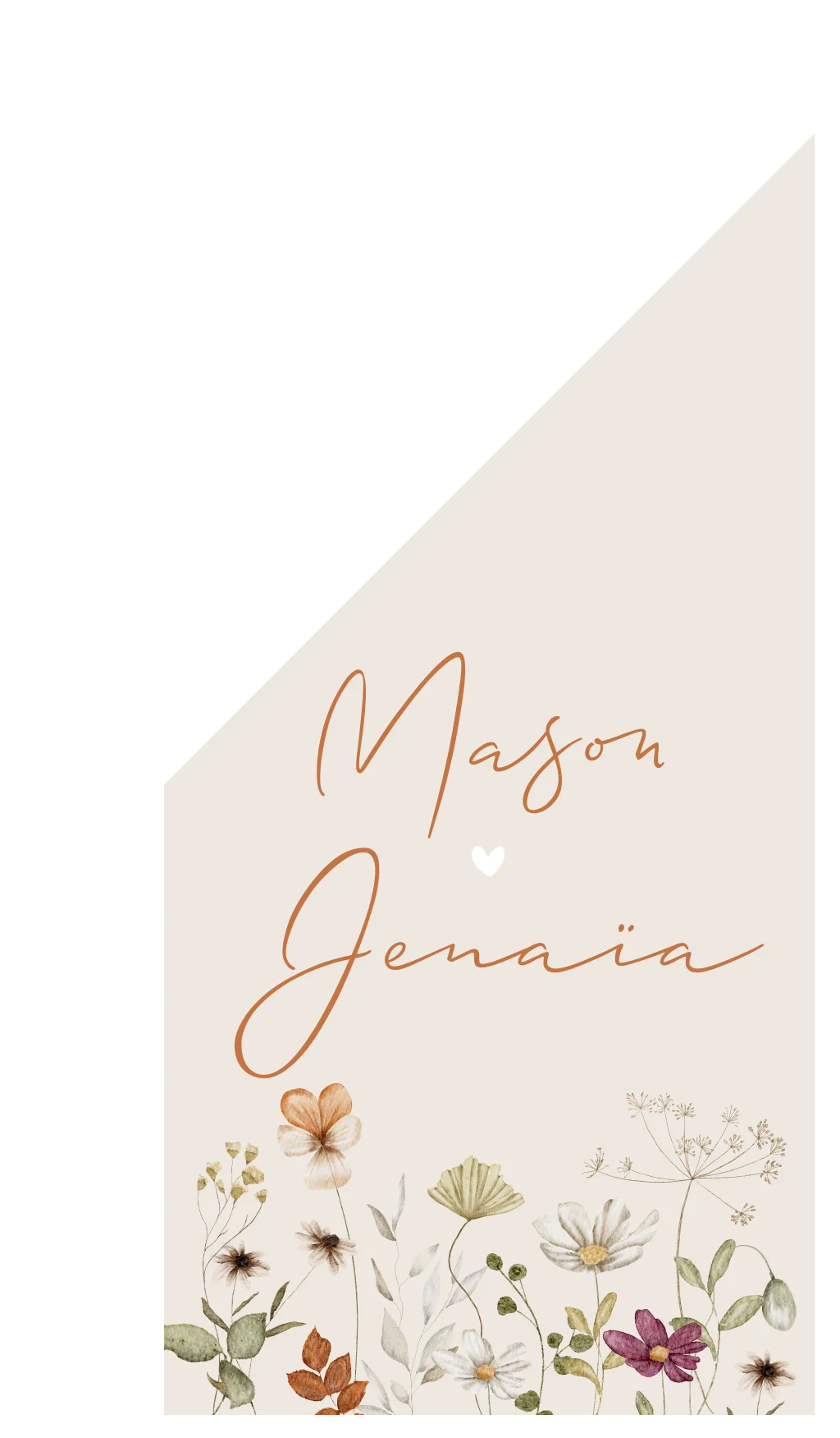 Een lieve en romantische vlag met allerlei waterverf bloemetjes in diverse kleuren voor een stel dat pas is getrouwd. Op huwelijksvlag Mason & Jenaïa staan de namen in een chique bruine kleur. Wil je graag iets aanpassen? Neem dan een kijkje in onze editor voor de vele opties!