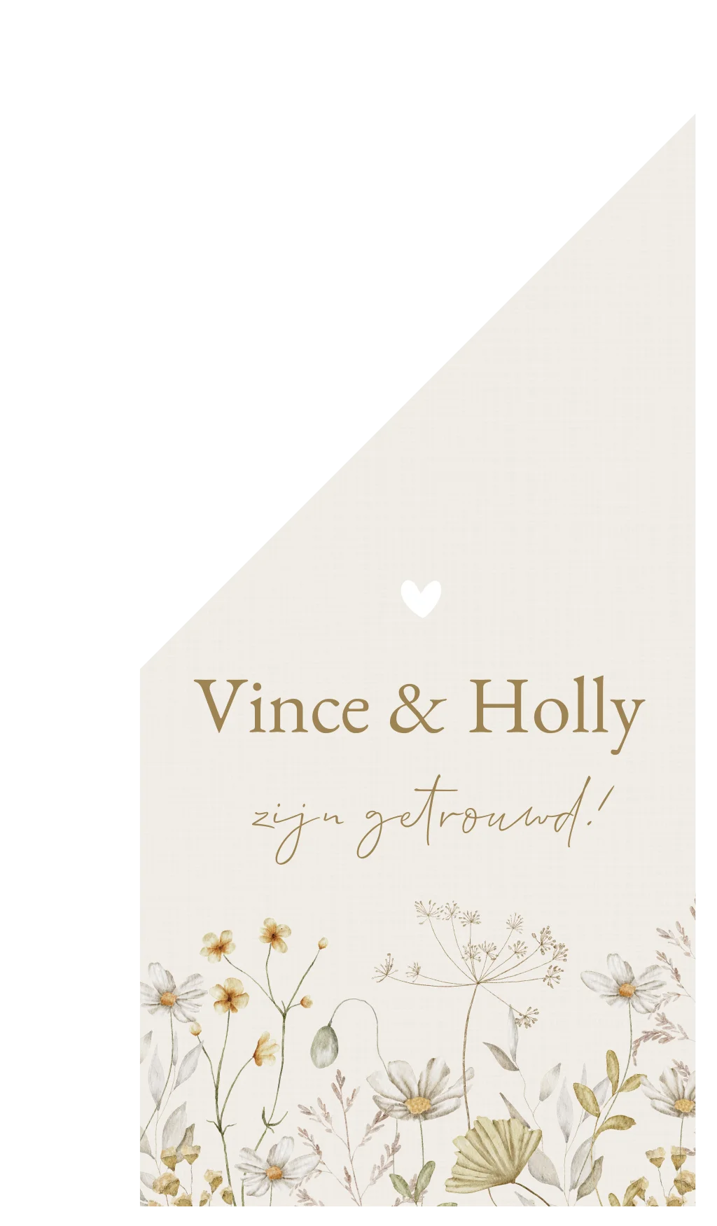 Een romantische vlag met een waterverf/aquarel illustratie van verschillende veldbloemen. Op de achtergrond zit een heel licht linnen effect. Deze vlag kun je voor vrienden/ familie bestellen die gaan trouwen. Vince & Holly zijn getrouwd. Deze vlag heeft een rustige uitstraling door het gebruik van één kleurenfamilie en wordt door het gebruik van klassieke lettertypes een tijdloos ontwerp. Wil je graag iets aanpassen? Neem dan een kijkje in de editor voor de vele opties!