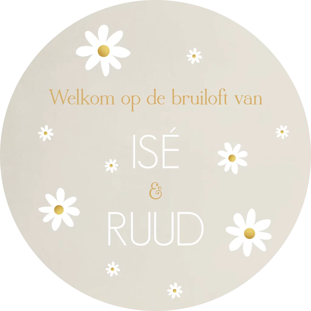 Rond welkomstbord met madeliefjes. Bewerk het welkomstbord naar eigen wensen in de editor.