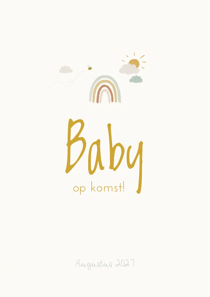 Een mooi kaartje voor een zwangerschapsaankondiging. Achter de wolken schijnt altijd de zon! Op dit kaartje is een lief regenboogje geplaatst, samen met een illustratie van de zon die doorbreekt achter de wolken en een vrolijk bijtje. Wil je het kaartje graag aanpassen? Neem dan een kijkje in onze editor voor de vele opties.